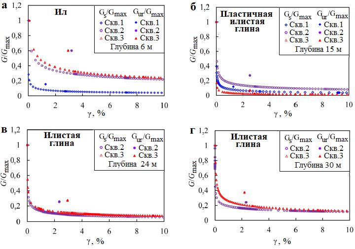 Кроме того, сравнивая рисунки 11, а–г, также можно обнаружить, что наиболее резкое снижение модуля сдвига наблюдается в пластичной илистой глине, где он быстро уменьшается в очень небольшом диапазоне увеличения деформации. Кроме того, в этом грунте остаточный модуль сдвига Gres является самым низким по сравнению с другими типами исследованных отложений. При суммировании значений Gres для разных типов грунтов было установлено, что они находятся в пределах от 0,01 до 0,24. Для ила (при сходимости решения) они попадают в диапазон 0,04–0,24, для пластичной илистой глины – в диапазон 0,01–0,08, для илистой глины – в пределы 0,08–0,23. Диапазон этого модуля для пластичной илистой глины явно ниже, чем для ила и илистой глины, что может указывать на относительно более высокую структурную целостность пластичной илистой глины. Что касается расхождений между кривыми, представленными на рисунке 11, а, то это может быть связано со скоплением в илистом слое довольно большого количества раковин двустворчатых моллюсков (как это и было замечено при полевых исследованиях).