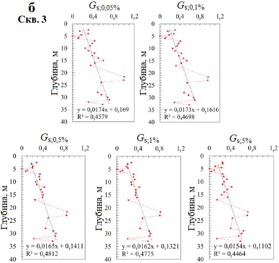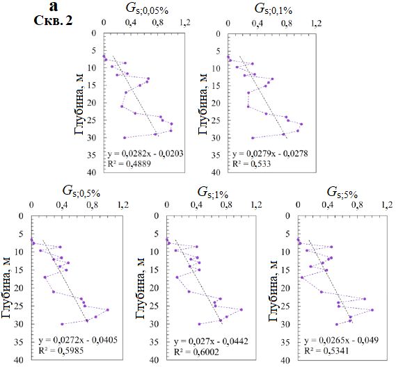 На основе разрозненных данных был построен ряд линий трендов изменений секущего модуля сдвига, нормализованного по отношению к глубине с помощью формулы (5). Хотя есть небольшое расхождение между графиками для скважин 2 и 3, их объединяет то, что наклон линий трендов уменьшается с ростом сдвиговой деформации. При увеличении деформации от 0,05 до 5% наклон этих линий для скважин 2 и 3 уменьшается соответственно с 0,0282 до 0,0265 и с 0,0174 до 0,0154 (см. пунктирные линии и формулы под ними на рис. 12). Это свидетельствует о том, что при росте сдвиговой деформации тенденция к увеличению модуля сдвига с глубиной замедляется. Когда сдвиговая деформация мала, различия между модулями сдвига с увеличением глубины значительны. С ростом сдвиговой деформации эти различия постепенно уменьшаются. В результате наклон линии тренда изменений секущего модуля сдвига, нормализованного по отношению к глубине с помощью формулы (5), несколько уменьшается с деформацией.
