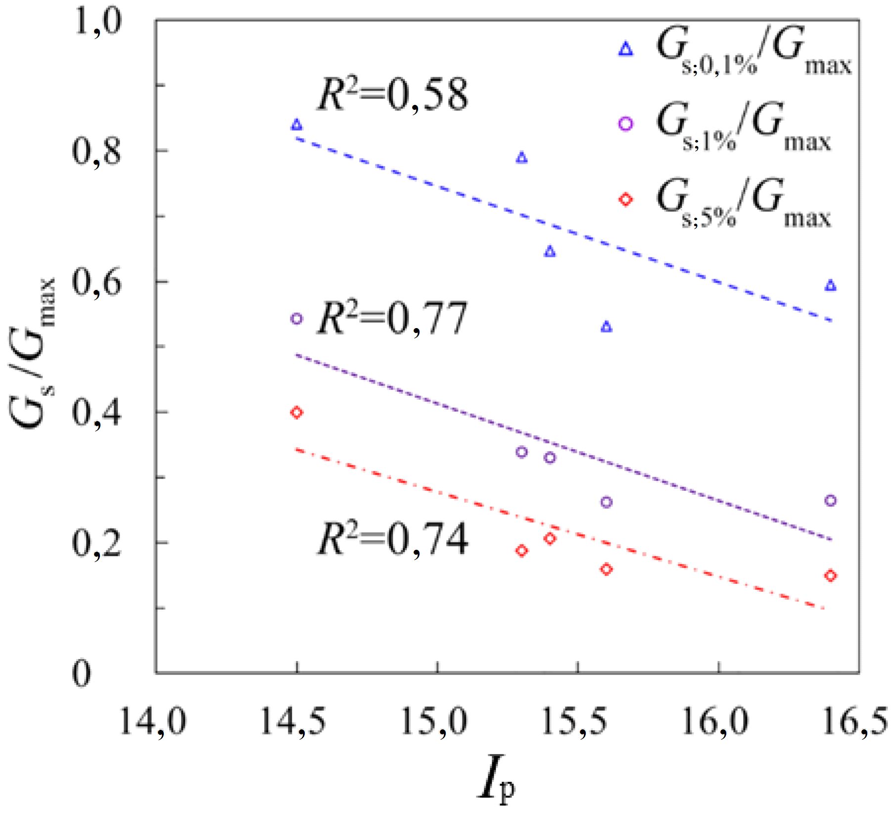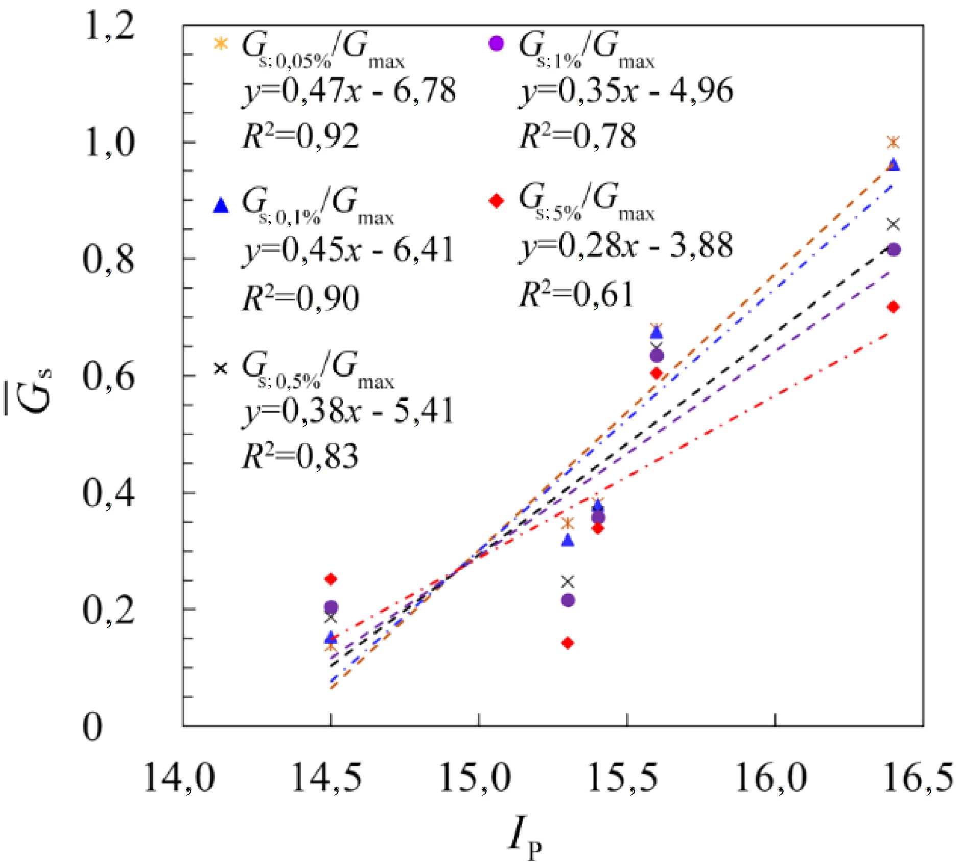 На рисунке 13 показаны корреляции отношения Gs/Gmax с числом пластичности Ip при различных деформациях сдвига. Видны в целом отрицательные зависимости. По мере увеличения числа пластичности отношение Gs/Gmax уменьшается. Это означает, что при одних и тех же деформациях чем выше будет число пластичности, тем ниже получится модуль сдвига, то есть тем больше будет скорость его уменьшения. Отсюда можно сделать простой вывод, что чем больше число пластичности, тем выше скорость ухудшения прочностных свойств дисперсного грунта.