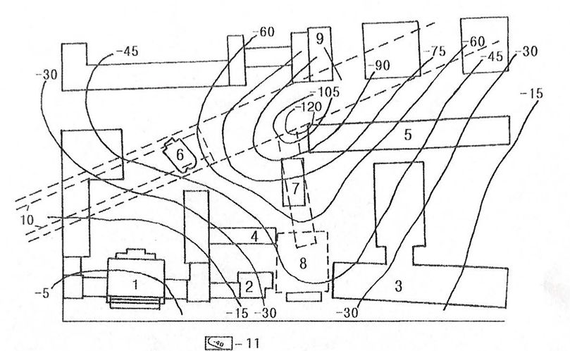 Надо сказать, что котлован для кассового вестибюля (обозначен цифрой 8 на рисунке 2) во время строительства использовался как площадка для строительства наклонного эскалаторного тоннеля к станции Боровицкая (цифра 7). И это послужило причиной еще одной проблемы. Концентрация подземных сооружений, предварительное водопонижение и увеличение дополнительной нагрузки при снятии пьезометрического давления подземных вод привело к тому, что в этом месте было резко нарушено напряженно-деформированное состояние грунтов. В этот момент начались деформации дневной поверхности. Если посмотреть на рисунок 2, то на нем видны изолинии, показывающие понижение грунта на всей прилегающей территории. Максимальные осадки составили 138 мм (на рисунке показано, что 120). Причем произошло это всего за 1 неделю. Именно в этом месте находится торцевая западная часть девятнадцатиэтажного железобетонного здания книгохранилища Ленинской библиотеки. Данная проблема оказалась гораздо страшнее и опаснее, чем деформации правого крыла Дома Пашкова. Из здания, претерпевающего серьезные деформации, со стороны Ваганьковского переулка вылетали стекла. Существовал серьезный риск выпадения металлических рам. В результате переулок был закрыт для движения.