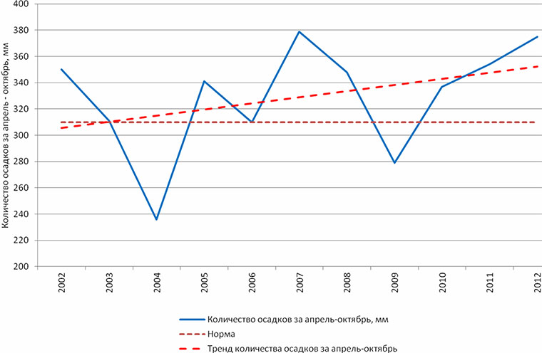 Рис. 2. Количество осадков за апрель – октябрь, мм, в 2002 – 2013 гг. по данным Ямало-Ненецкого центра по гидрометеорологии и мониторингу окружающей среды для метеостанции «Салехард»