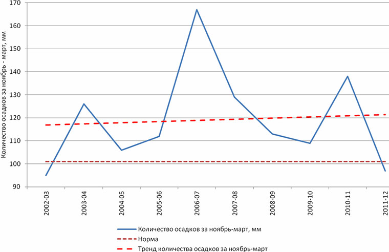 Рис. 3. Количество осадков за ноябрь – март, мм, в 2002 – 2013 гг. по данным Ямало-Ненецкого центра по гидрометеорологии и мониторингу окружающей среды для метеостанции «Салехард»