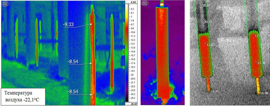 Рис. 6. Результаты тепловизионной диагностики работы теплоотдающих элементов вертикальных термостабилизаторов (изображения на экране тепловизора). Слева и в центре – работающие индивидуальные СОУ; справа – частично неработающие [3, 4]