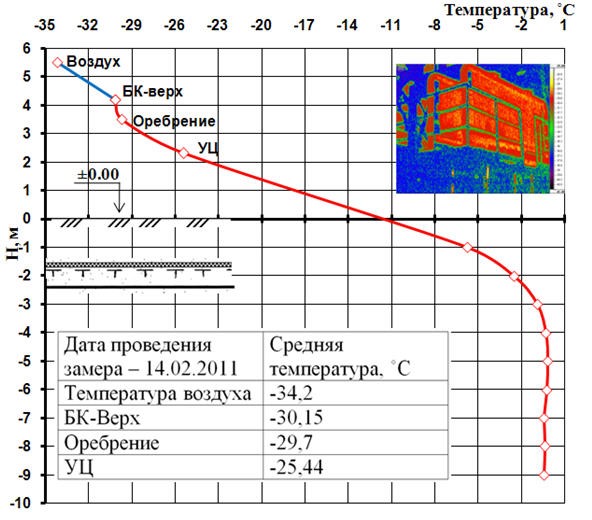 Рис. 7. Результаты тепловизионной диагностики и график распределения температур в системе «грунт – СОУ – воздух» на центральном пункте сбора нефти РВС-2000 Т-4310 А. При температуре наружного воздуха минус 34,2°C температура грунта на вертикальной отметке H = -9 м составляет минус 1,5°C [3]