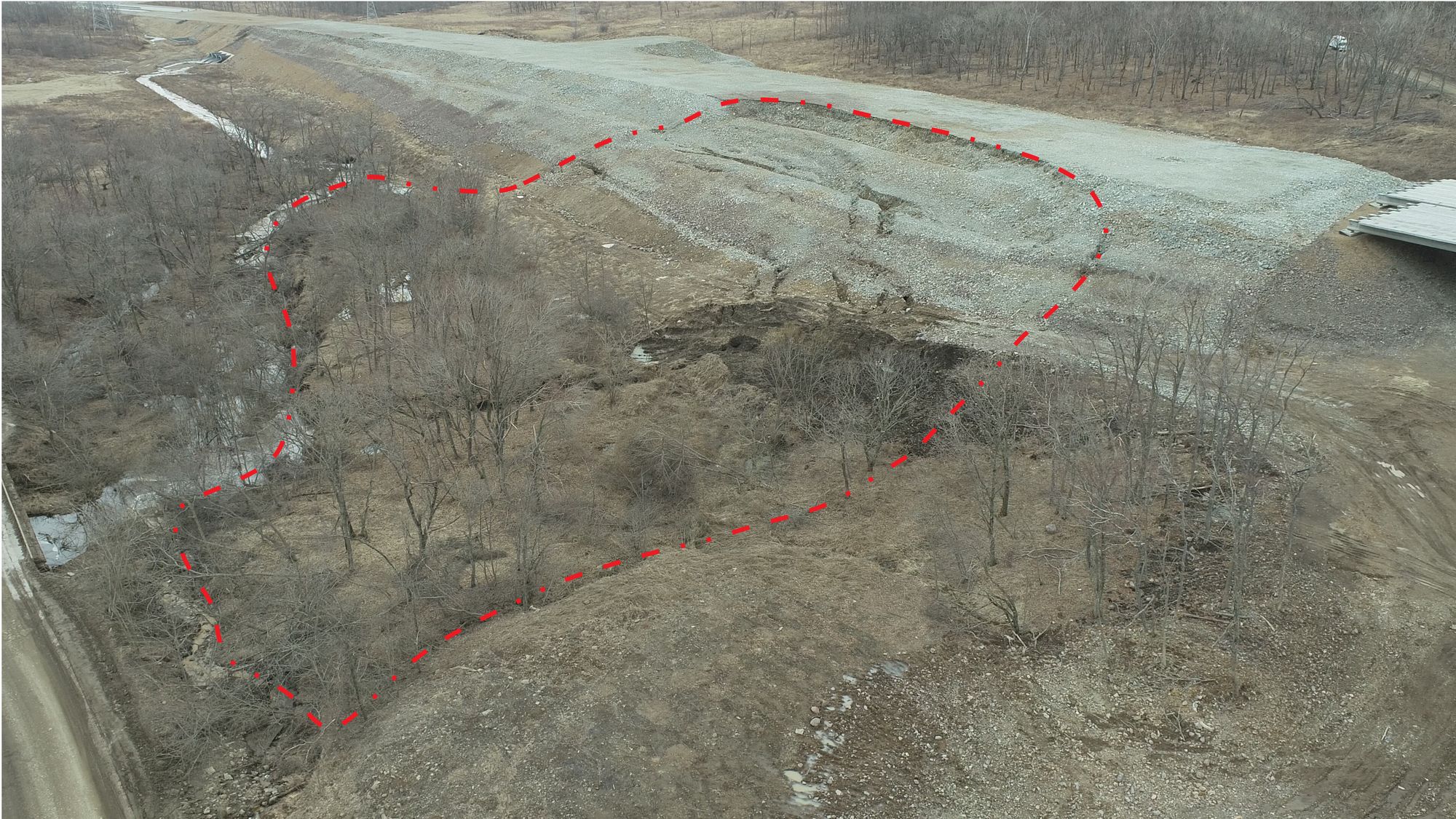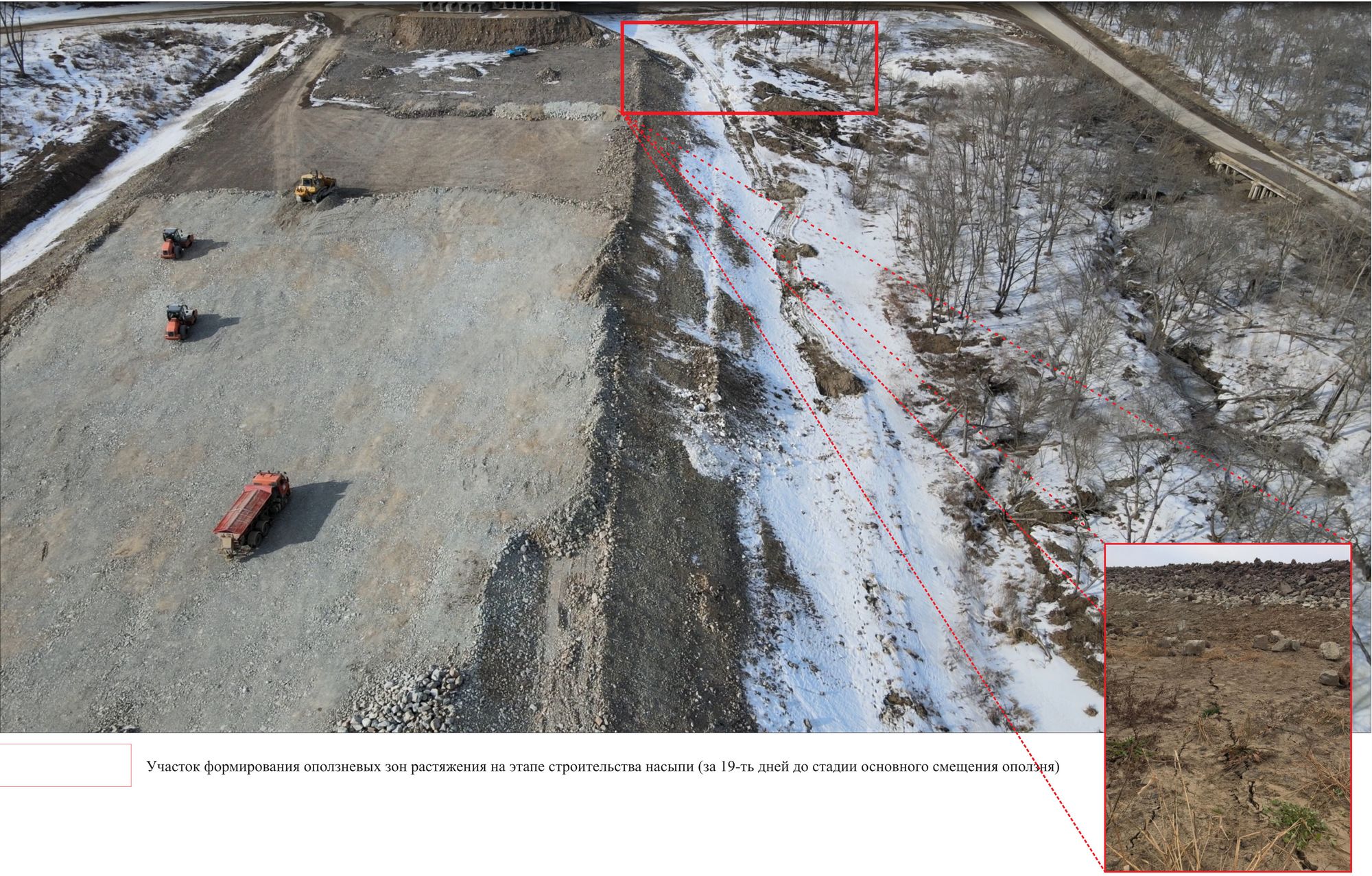 Рис. 1. Участок формирования оползневых зон растяжения на этапе строительства насыпи (за 19 дней до стадии основного смещения оползня)
