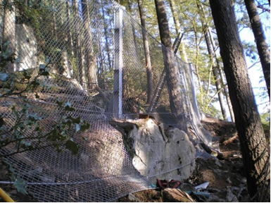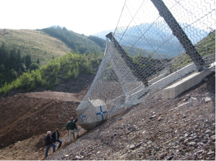 Сначала была выполнена оборка склона, то есть его очистка от свободно лежащих, неустойчивых и потенциально опасных камней при помощи ломов и даже буровзрывных работ, иногда с анкерным креплением потенциально опасных участков и с обязательным хотя бы временным ограждением нижележащих зон [4, 8]. Затем в местах обнажений скальных пород были устроены сетчатые противокамнепадные завесы, уложены и закреплены их несущие тросы с использованием анкерных креплений.