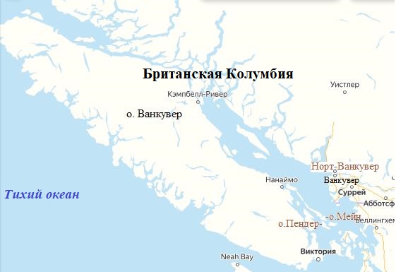 Рис. 4. Расположение города Норт-Ванкувер и островов Пендер и Мейн на карте (по [9])