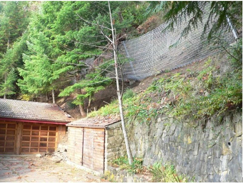 Однако в одном месте, где два частных дома располагаются на опасном слоне друг над другом, было невозможно принять индивидуальные защитные меры по стабилизации склона из-за проблем с границами землевладений. Там был устроен общий противокамнепадный барьер высотой 2 м и длиной 20 м, рассчитанный на динамические воздействия с энергией до 1000 кДж, способный улавливать достаточно крупные блоки скальных пород. Для безопасности оборка склона выполнялась после создания барьера.