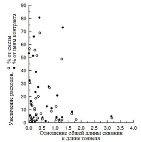 Рис. 4. Увеличение итоговых расходов по проектам строительства тоннелей в зависимости от относительной общей длины скважин, пробуренных при изысканиях (по [5, 8])