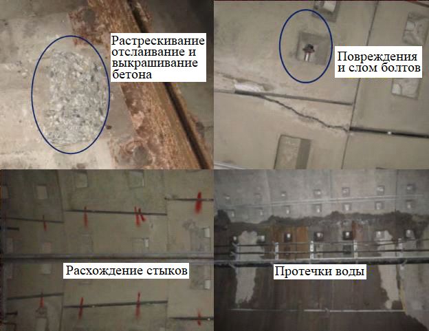 перегрузка поверхности земли над линией метро в Шанхае вызвала чрезмерную деформацию обделки тоннеля (рис. 1), что привело к растрескиванию бетона, повреждениям и сломам болтов, расхождениям стыков между секциями и проникновению воды [10]. Опасность также представляют другие строительные работы, производимые поблизости во время эксплуатации, из-за которых появляются риски, связанные с ухудшением структурных характеристик тоннелей [11–14]. Кроме того, для безопасной эксплуатации тоннелей, построенных щитовым способом, создают проблемы внутрирусловая эрозия и сезонные изменения уровня грунтовых вод (УГВ).
