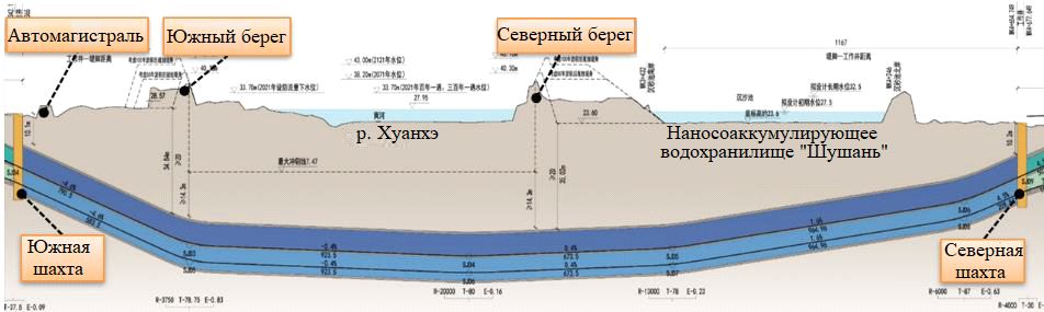 Рис. 3. Схематичный продольный разрез вдоль трассы тоннеля через реку Хуанхэ