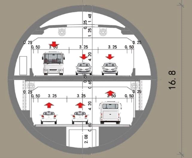 Это шестиполосный тоннель с круглым сечением и двумя уровнями, имеющими по три полосы. Глубина его заложения от поверхности грунта составляет от 10,3 до 49,5 м. Его наружный диаметр, внутренний диаметр и ширина сегментного кольца равны 15,2, 13,9 и 2,0 м соответственно. Сегментное кольцо обделки тоннеля разделено на 12 блоков. Элементы соединены между собой с помощью наклонных болтов и смонтированы в шахматном порядке. Стандартное поперечное сечение тоннеля показано на рисунке 4.