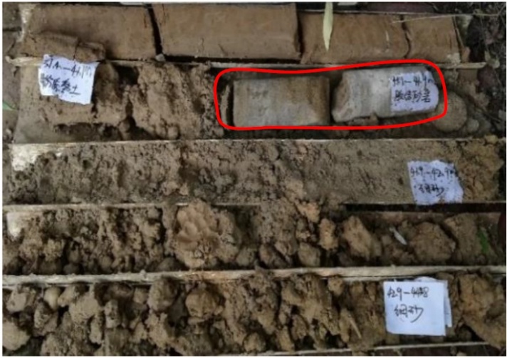 Рис. 5. Образцы керна из сцементированного песка (обведены красным)