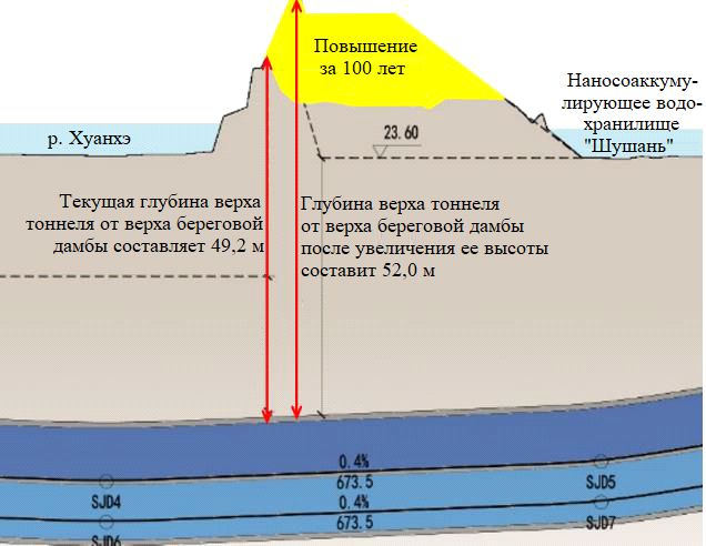 УГВ вдоль трассы тоннеля все время меняется из-за обмена между грунтовыми водами и водами Хуанхэ. Различия между уровнями грунтовых вод в разные времена года (например, в сезон дождей и в период маловодья) могут существенно меняться. Изменения УГВ приводят к последующим изменениям во внутренних усилиях в обделке тоннеля и к ее деформированию. Если уровень грунтовых вод меняется слишком сильно, то, соответственно, увеличивается воздействие окружающего грунта на обделку тоннеля, что может в результате привести к возникновению трещин или неравномерным деформациям. Поэтому на этапе проектирования необходимо учитывать влияние изменений УГВ на обделку тоннеля со сроком службы 100 лет.