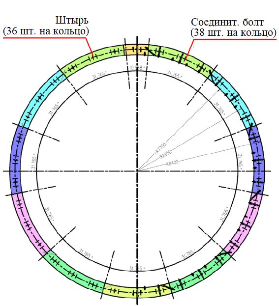 Рис. 11. Распределение штырей и болтов для соединения сегментных колец между собой