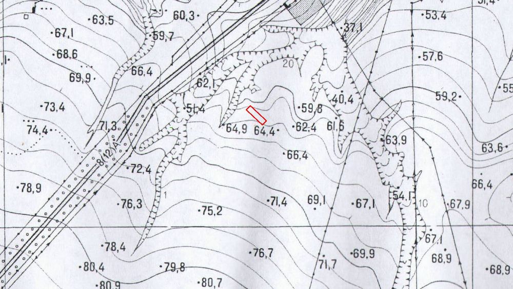 Рис. 7. Архивные результаты топосъемки 1960-х годов, отразившие только контур предположительно засыпанного старого оврага. Красным прямоугольником показан контур рассматриваемого аварийного дома