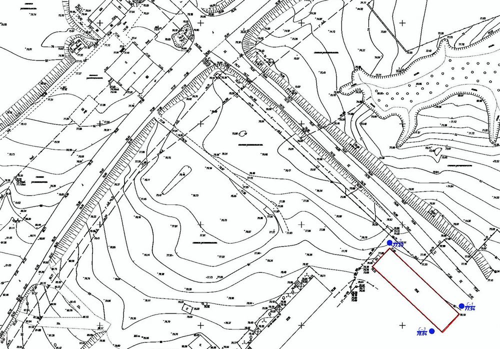 Рис. 8. Результаты современной топографической съемки территории расположения рассматриваемого дома, контуры которого показаны в виде темно-красного прямоугольника. Cиние кружки показывают места расположения инженерно-геологических скважин.