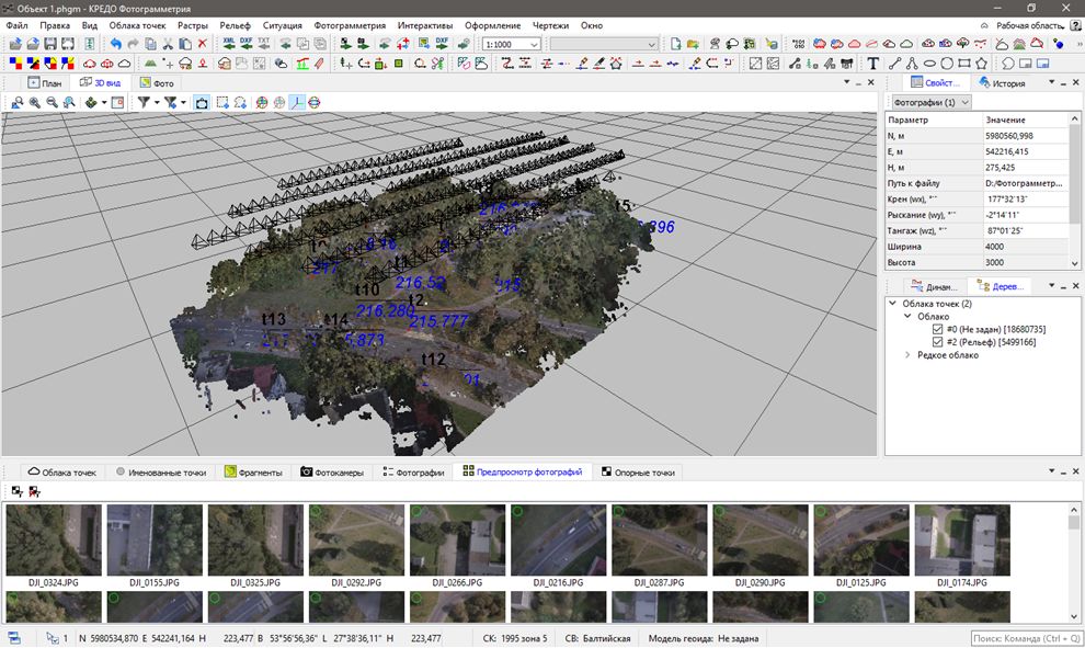Полученные в результате фотограмметрической обработки материалы – плотное облако точек и ортофотоплан – могут быть экспортированы в распространенные форматы или использованы в качестве основы для создания цифровой модели местности в программе КРЕДО Фотограмметрия. Наличие вместе с проектом исходных фотоснимков и возможность быстрого и удобного выбора и просмотра необходимого изображения позволяет при необходимости уточнять характеристики объектов или другие детали, недоступные для анализа на ортофотоплане или облаке точек.
