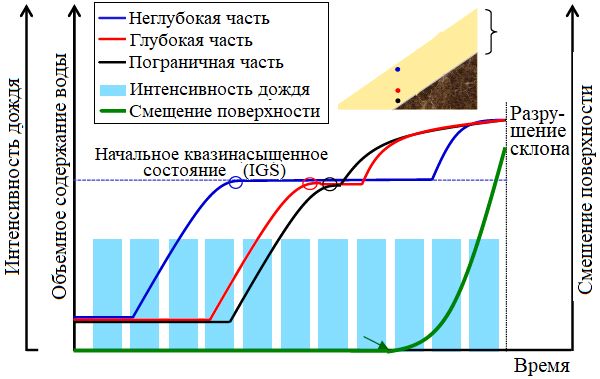 Авторы уточнили взаимосвязь между объемным содержанием воды (объемной влажностью) на разной глубине и смещением (деформацией сдвига) на основе результатов прошлых исследований, полученных с использованием экспериментов на модельном откосе, как показано на рисунке 1 [6, 7]. Когда происходит инфильтрация дождевой воды в модельный откос, сначала начинает увеличиваться объемная влажность в его неглубокой части (см. синюю точку на рисунке 1), а затем она начинает расти в двух точках (красной и черной на рисунке 1) более глубокой части – непосредственно над подошвой поверхностного слоя, причем от красной точки к черной. Затем данные участки достигают квазинасыщенного водой состояния. В этих условиях гидравлическая проводимость (водопроницаемость) при ненасыщенном состоянии теоретически уравновешивается интенсивностью дождевых осадков, если только их интенсивность не превышает гидравлическую проводимость при насыщенном состоянии. Это указывает на то, что воздух все еще присутствует в порах грунта. В дальнейшем, если происходит постоянная инфильтрация дождевой воды в откос, в более глубокой части (над подошвой верхнего слоя грунта) образуется слой воды и ее объемное содержание снова начинает увеличиваться начиная с этой границы кверху. Это означает, что с повышением уровня воды воздух в порах грунта замещается поровой водой и ее объемное содержание снова увеличивается от этой пограничной части к менее глубокой. Затем происходит неглубокий оползень, вызванный уменьшением эффективного напряжения из-за порового давления воды.