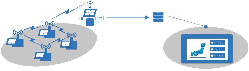 Мониторинг был начат в ноябре 2017 года. Его данные отправлялись на веб-сервер каждые 10 минут через «интернет вещей» (компьютерную сеть, объединяющую все используемые при мониторинге устройства) с использованием технологии беспроводной сенсорной сети, как показано на рисунке 3. Сенсорные узлы, которые работали от солнечного источника электропитания, могли взаимодействовать друг с другом через беспроводную сенсорную сеть в прерывистом режиме. В представленном в данной статье исследовании авторы проанализировали результаты мониторинга в точке А (см. рис. 2) во время сильных дождей в июле 2018 года.