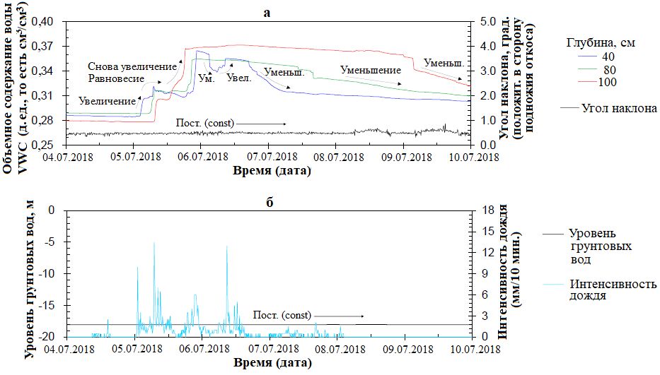 На рисунке 4 показаны изменения во времени объемной влажности грунта, угла наклона, уровня грунтовых вод и интенсивности осадков в точке мониторинга А в период сильных дождей в июле 2018 года. Из рисунка видно, что, хотя объемное содержание воды и растет с увеличением интенсивности дождя и инфильтрации осадков на каждой глубине (причем сначала на глубине 40 см, потом на глубине 80 см и потом на глубине 100 см), но в какой-то момент этот рост временно замедляется и достигается равновесное состояние. Точки этих изменений соответствуют величинам IQS для каждого датчика (см. рис. 1). И понятно, что объемное содержание воды на каждой глубине в этих точках достигает квазинасыщенного состояния. Другими словами, было подтверждено, что результаты мониторинга реального откоса хорошо согласуются с показанным на рисунке 1 (то есть с рассмотренной ранее концепцией).