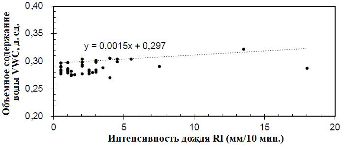 Рис. 6. Связь между объемным содержанием воды на небольшой глубине (40 см) и максимальной интенсивностью дождя для каждого периода выпадения осадков с ноября 2017 года по август 2018 года