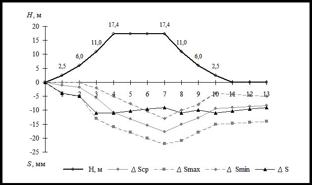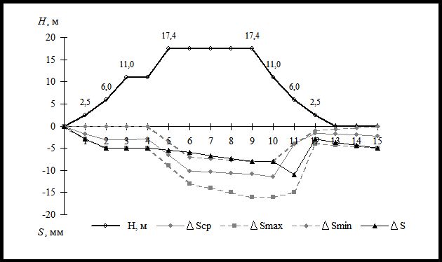 а)средняя осадка (ΔSср) конструкции по периметру при заполнении до отметки 17,4 м составила 18 мм;