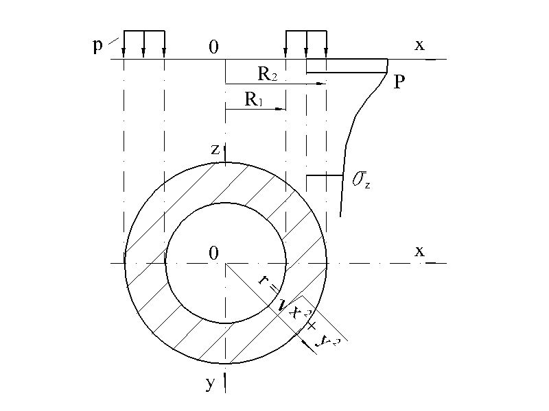Рис. 2. Схема к определению осадок кольцевого фундамента, нагруженного равномерно распределенной нагрузкой