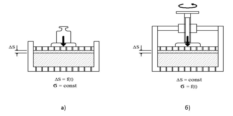 Если в обычном режиме компрессионных испытаний нагружение осуществляется ступенями статических нагрузок (рис. 1, а), то в режиме релаксации грунт принудительно деформируется на заданную величину перемещения (рис. 1, б), после чего напряжения постепенно падают (релаксируют).