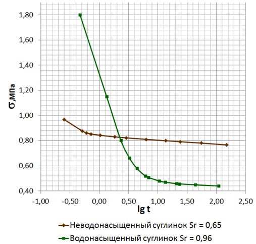 Рис. 4. Зависимость напряжения от логарифма времени для суглинка различного водонасыщения