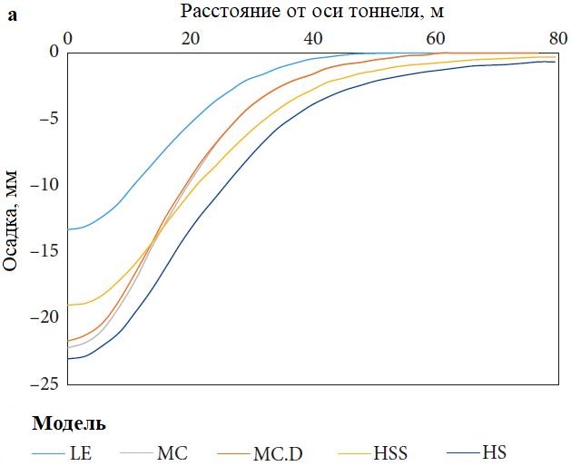 Диас и Безуйен [25] выполнили подробный анализ для одиночного тоннеля диаметром 8 м, находящегося на глубине 30 м от поверхности земли, как показано на рисунке 3, а. Они сравнили модели: линейно-упругую (Linear Elastic – LE), Мора – Кулона (MC), Мора – Кулона с учетом дилатансии (MC.D), упрочняющегося грунта (Hardening Soil – HS) и упрочняющегося грунта при малых деформациях (HS small, HSS). На основании результатов своего исследования эти авторы сделали вывод, что модель MC завышает осадки, а наиболее подходящей является модель HSS, которая дает наиболее реалистичные величины осадок.