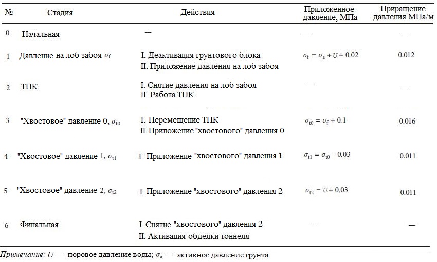 Для структурного моделирования метод учета давления при нагнетании тампонажного раствора за обделку (grout pressure method) более реалистичен по сравнению с методом усадки (contraction method) и методом учета снимаемых напряжений (stress reduction method), поскольку он моделирует непосредственно сам метод строительства, позволяет получить точную ширину мульды оседания и значения внутренних усилий в конструкции наряду со смещениями (при моделировании тоннеля методом усадки реалистичные усилия в обделке и перемещения одновременно получить невозможно; внутренние усилия в обделке получают для состояния без усадки. – Ред.) [26, 27]. Поэтому проходка трех тоннелей моделировалась при настоящем исследовании с помощью модели HSS в сочетании с методом учета давления при нагнетании тампонажного раствора за обделку. При этом рассматривался метод учета умеренного давления нагнетания (self-composed grout pressure method), включающий в себя шесть промежуточных стадий (таблица 1). Принятая модель способна моделировать все стадии строительства при проходке тоннелей с помощью ТПМК [24]. Давление в забое [28, 29] и давление при нагнетании за хвостовую оболочку щита [30–32] были тщательно выбраны на основе существующих публикаций.