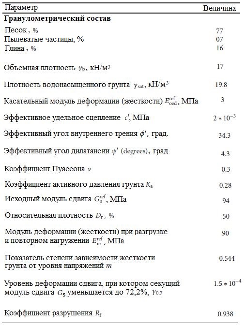 Геологический разрез, использованный в настоящем исследовании, состоит из мощного слоя супеси (SC в соответствии с Единой системой классификации грунтов – USCS) с уровнем грунтовых вод (УГВ) на глубине 5 м от поверхности земли. Параметры грунта приведены в таблице 4.
