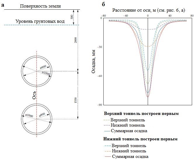 Рис. 10. Мульды оседания при последовательности строительства тоннелей тройной системы «левый – правый – верхний» (а); вертикальные смещения в грунтовом массиве в изолиниях для этой  последовательности (б)
