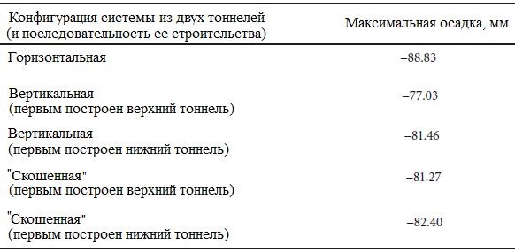 Таблица 5. Максимальные осадки при разных конфигурациях и последовательностях строительства систем из двух тоннелей