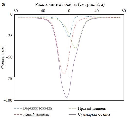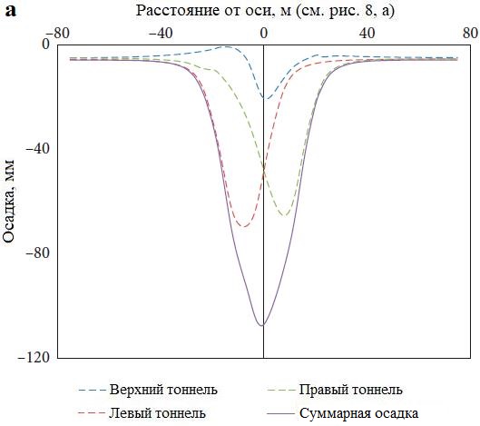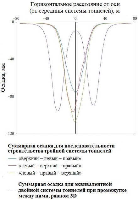 3. Для системы из трех тоннелей очень важную роль в отношении влияния на осадки играет последовательность строительства. Чем раньше по отношению к остальным будет построен верхний тоннель, тем меньше будут осадки грунта.