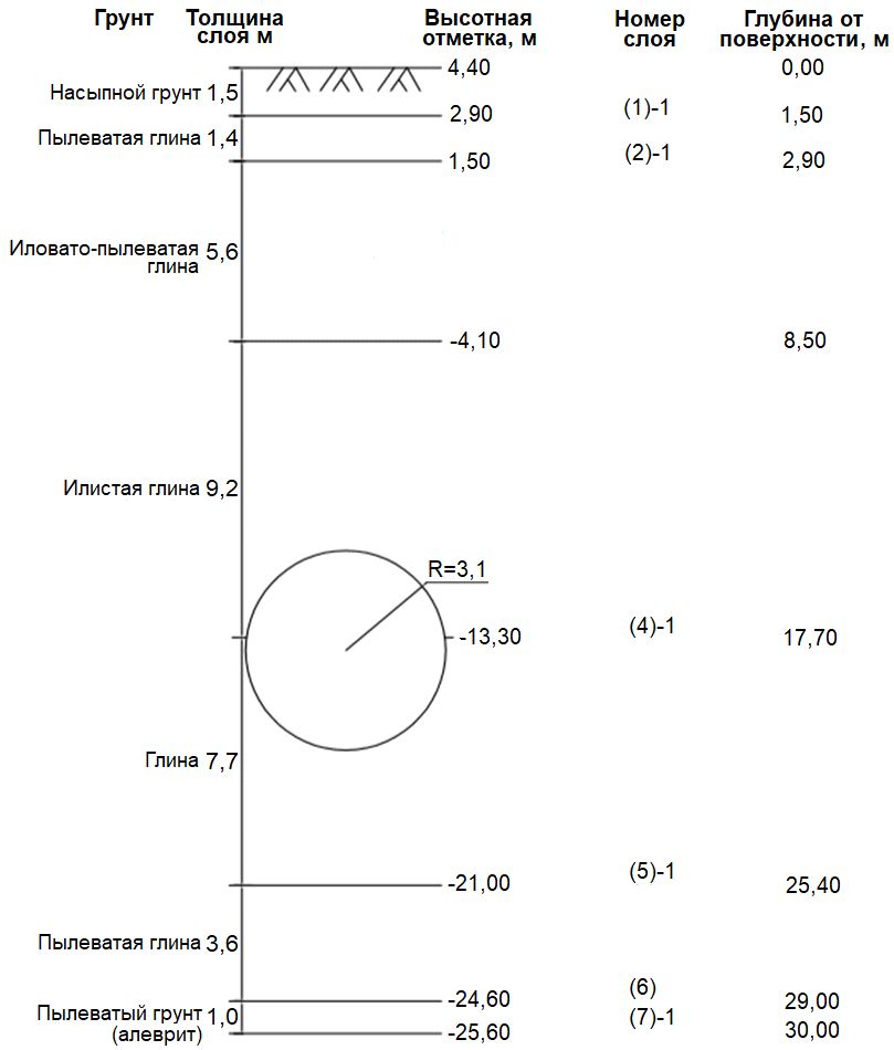 Для создания модели были выбраны грунтовые условия на участке территории Шанхая между станциями метро Фанхуа-Роуд и Луньян-Роуд линии № 7, где типичный геологический разрез в диапазоне глубины инженерно-геологической скважины 30 м состоит из 7 слоев – в основном слабых глин (рис. 1). Глубина заложения тоннеля составляет 15 м.