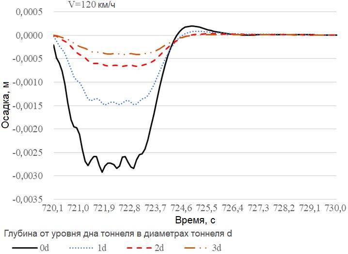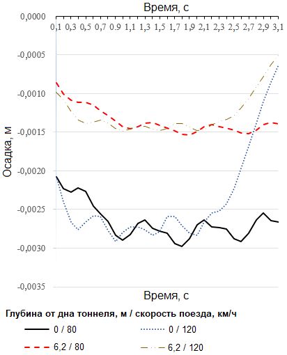 1. Оседание грунта под тоннелем на одной и той же глубине при обычной скорости движения поезда больше, чем при более высокой скорости. При обычной скорости деформирование грунта под тоннелем в ответ на нагружение является более выраженным, кривая изменений осадок после приложения нагрузки является более «крутой и высокой» по сравнению с кривой в случае более высокой скорости.
