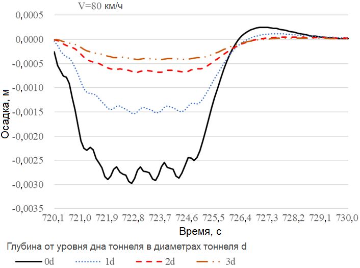 Рис. 5. Осадки грунта под тоннелем в результате пятого приложения нагрузки при скорости поезда 80 км/ч