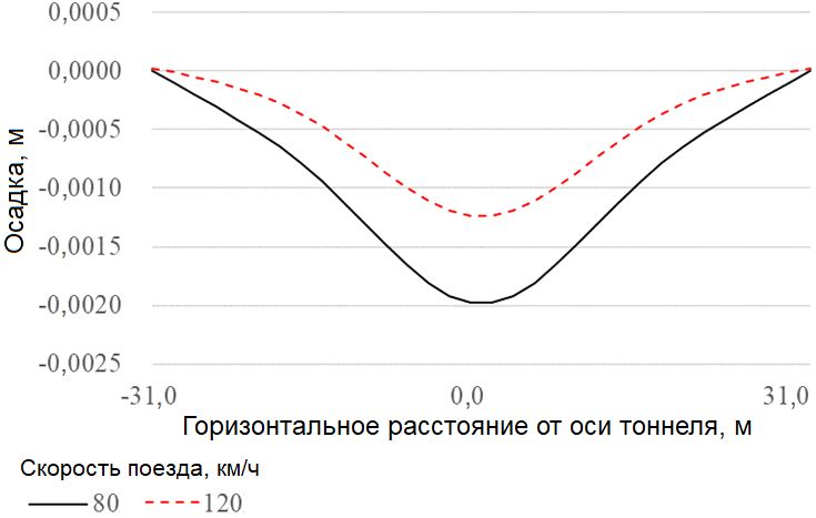 На рисунке 7 показаны кривые осадок дневной поверхности в пределах мульды оседания над тоннелем при различных скоростях поезда. Из этого рисунка видно, что мульда оседания поверхности при обычной скорости поезда (80 км/ч) выражена сильнее и ее глубина в середине больше, чем при более высокой скорости (120 км/ч), при этом осадки уменьшаются с увеличением поперечного горизонтального расстояния от оси тоннеля. При постепенном увеличении скорости поезда форма мульды оседания в поперечном тоннелю направлении будет постепенно меняться от «глубокой и узкой» до «мелкой и широкой».