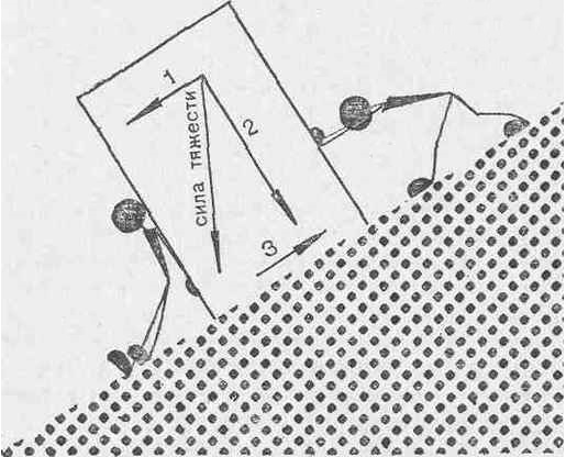 Рис. 5. Силы, действующие на снежный параллелепипед, находящийся на склоне: 1 – составляющая силы тяжести, параллельная склону и стремящаяся сдвинуть снег вниз по наклонной поверхности; 2 – составляющая силы тяжести, перпендикулярная поверхности склона, уплотняющая снег и прижимающая его к склону; 3 – силы сцепления и трения (сопротивления сдвигу). Если же показанный на рисунке параллелепипед рассматривать как часть сплошного снежного покрова на склоне, то его будут удерживать на склоне (или наоборот, тащить с собой) также контурные силы [11]