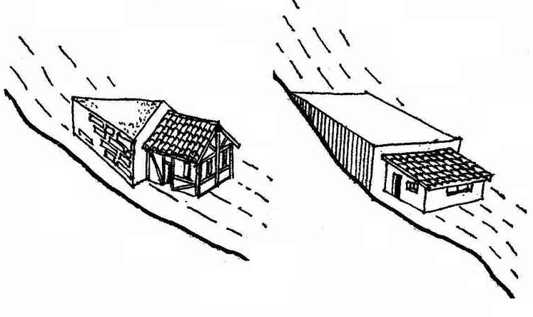 Жители гор давно многое знают о защите своих домов от разрушения лавинами путем использования элементов естественной защиты (например, выступов скал). При этом, например, на Кавказе и в Альпах многие народы издавна обладали знаниями и о лавинобезопасном строительстве своих домов. Например, они врезали заднюю стену дома или убежища на высокогорном пастбище в крутой склон, а крышу делали плоской, чтобы беспрепятственно пропустить лавину. При этом во врезанной в склон части строения они устраивали погреб, где можно было укрыться во время схода лавины. Либо они делали обращенную к склону стену наиболее прочной и в форме утюга, чтобы рассечь лавину на две части и опять же почти беспрепятственно пропустить ее (рис. 6). Уже с начала XVIII века они начали строить галереи на тропах и дорогах для укрытия торговых обозов, людей и животных от лавин, обвалов и камнепадов.
