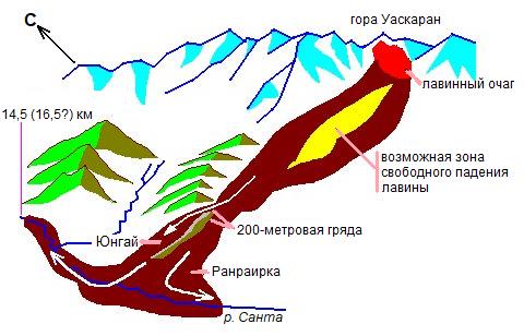 Рис. 9. Условная схема пути сорвавшегося с Уаскарана ледника в 1970 году (по [26])