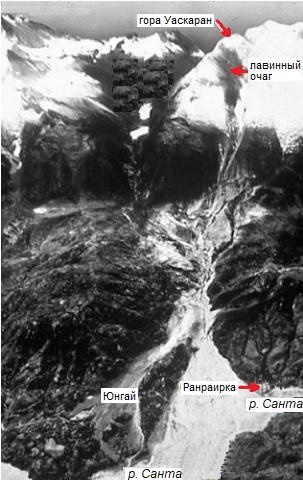 Рис. 10. Погибшие Юнгай и Ранраирка на снимке, сделанном с самолета после схода с Уаскарана ледника в 1970 году (по [26])
