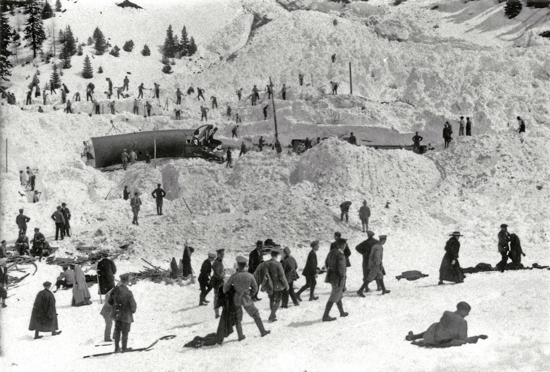 Рис. 1. Подсчет разрушений после схода большой лавины со склона горы Друзача в Швейцарии, которая перегородила железнодорожные пути в 1917 году и погубила 6 человек [2]