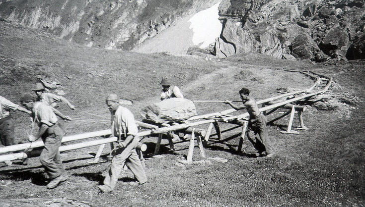 Рис. 4. Постройка стен из камня в зоне обычного отрыва лавины рядом с Кандерштегом в Швейцарии в 1940 году [2]