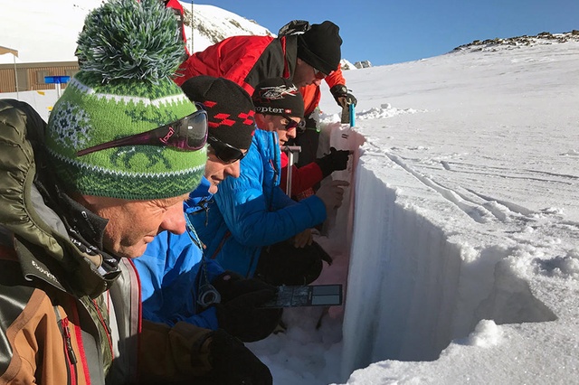Рис. 10. Повышающие квалификацию члены Общественной ассоциации наблюдателей за снежными лавинами под руководством сотрудников института SLF учатся анализировать состояние и структуру снежного покрова по стенке шурфа и отслеживать его неустойчивые слои [1]