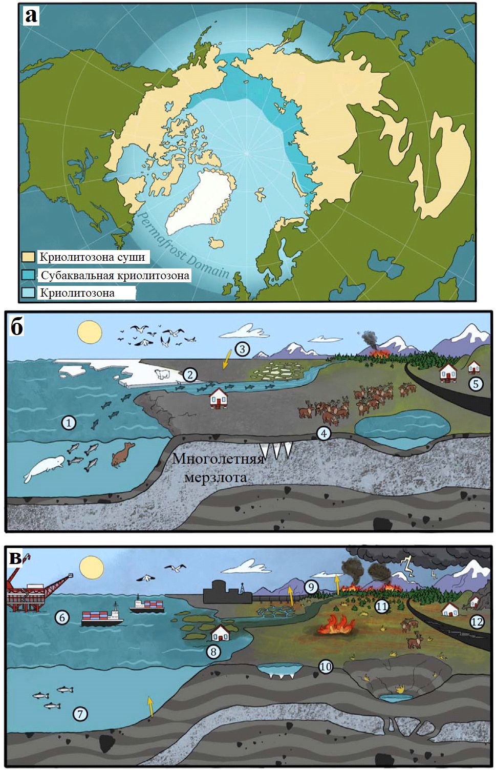 Рис. Криолитозона и возможные сценарии ее будущего: а – наше определение криолитозоны включает наземные и морские регионы со значительным распространением многолетней мерзлоты, включая океаны и моря к северу от 50°с.ш., подводную многолетнюю мерзлоту на континентальных шельфах, арктическую тундру, бореальные леса и высокогорную многолетнюю мерзлоту; б, в – возможные сценарии будущего криолитозоны: б – ускоренное сокращение выбросов парниковых газов: 1 – устойчивые биологические сообщества в морских, прибрежных и наземных экосистемах; 2 – сохранение морского льда, особенно многолетнего и прибрежного; 3 – сохранение отрицательного баланса парниковых газов (когда поглощение превышает выбросы) в криолитозоне.; 4 – восстановление многолетней мерзлоты и уменьшение мощности активного слоя (уменьшение глубины сезонного протаивания); 5 – сохранение социокультурной среды и инфраструктуры; в – продолжение использования ископаемого топлива: 6 – расширение добычи ископаемого топлива и морской навигации; 7 – нарушение пищевых цепей, миграций и биологических сообществ в наземных и морских регионах; 8 – ускорение береговой эрозии, усиление изменений первичной продуктивности пресноводных и морских экосистем, закисления океана, эрозии грунтов на суше, в том числе выноса загрязняющих веществ; 9 – переход к положительному балансу парниковых газов (когда выбросы таких парниковых газов, как метан, углекислый газ и закись азота, превышают их поглощение) в криолитозоне; 10 – широкомасштабная деградация многолетней мерзлоты, в том числе увеличение мощности активного слоя (увеличение глубины сезонного протаивания), образование и осушение озер; 11 – интенсификация деструктивных процессов на суше, в том числе лесных пожаров, экстремальных гидрологических явлений, термокарста, трансформации растительных сообществ и экспансии инвазивных видов; 12 – кардинальные нарушения социокультурной среды и инфраструктуры