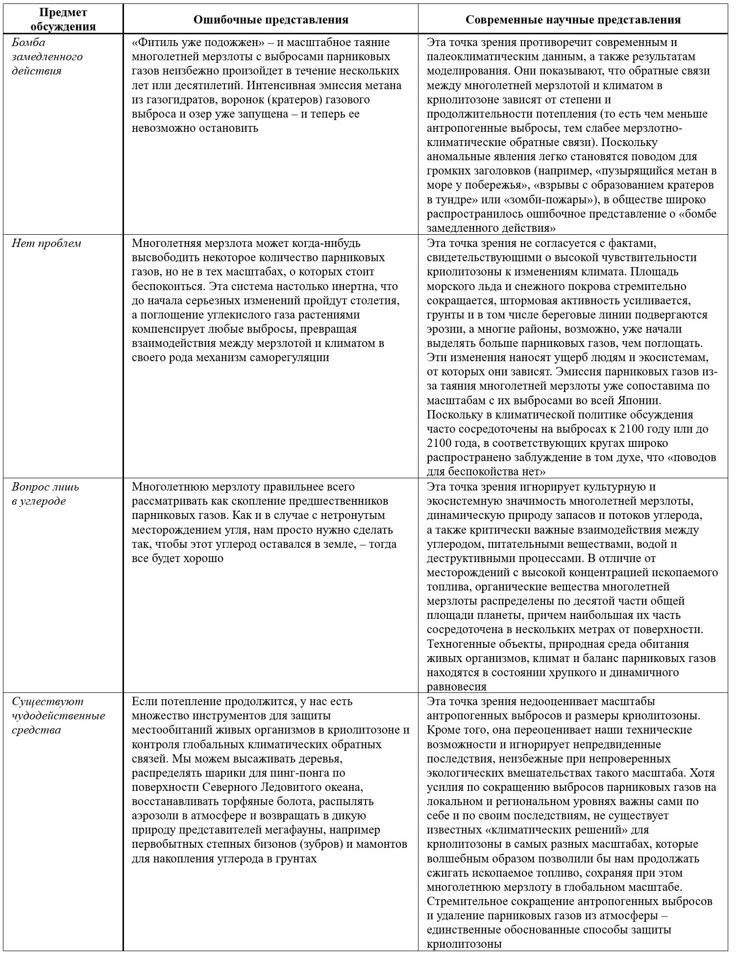 Таблица. Распространенные ошибочные представления о взаимодействиях многолетней мерзлоты и климата и современное понимание этих процессов
