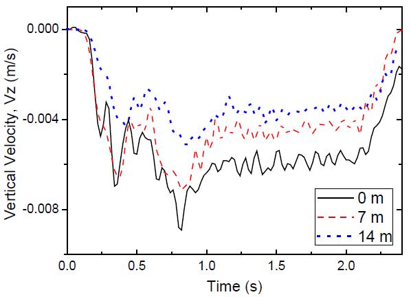 Рис. 5. Изменения вертикальной составляющей виброскорости на поверхности земли во времени в зависимости от расстояния от свода тоннеля до дневной поверхности (0; 7; 14 м) [1]. По оси абсцисс – время (c), по оси ординат – вертикальная составляющая виброскорости Vz (м/c)